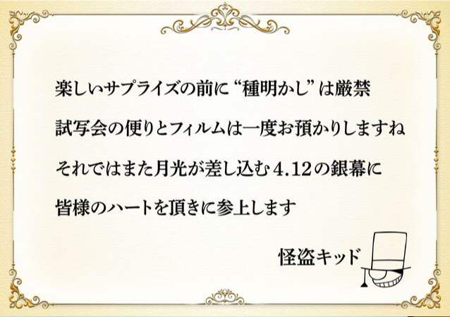 『100万ドルの五稜星』では、 試写会中止を「怪盗キッドがフィルムを盗んだ」という演出で発表した。